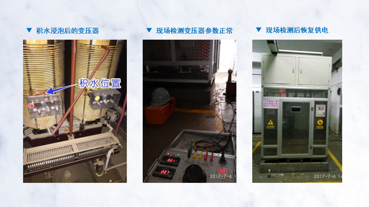 受暴雨影响,配电房受洪水浸泡,10台变敞开干变已被水浸到达高压分接档位,造成小区供电中断。经简单处理后,现场检测各项指标正常,可立即恢复正常供电。