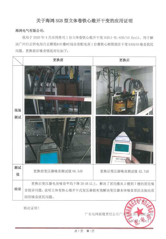 广州白云区白云雅苑10楼综合配电房内一台630kVA的叠铁心树脂浇注干变噪音过大,严重影响2-7楼居民日常休息。广州白云供电局选用九游老哥J9俱乐部官网电气SGB11-RL-630/10敞开式立体卷铁心干式变压器进行更换,更换后配电房噪音水平从66.5分贝降到42.7分贝。敞开式立体卷铁心干式变压器结构坚固稳定,有效解决变压器器身噪音原因及振动引起的噪音问题。