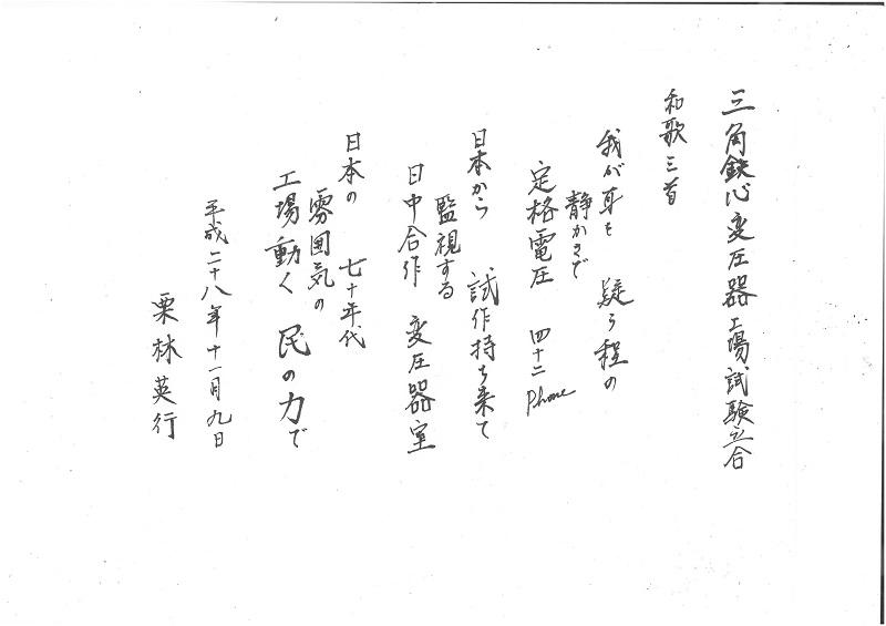 [1]诗歌的大致意思:第一首:若非亲耳听闻,我无法相信变压器运行时能如此宁静安详!第二首:中日合作——现场将日方带来的监控装置安装到九游老哥J9俱乐部官网的箱变里进行测试;第三首:九游老哥J9俱乐部官网公司的工作环境整洁有序、员工充满激情士气高涨,让我恍若置身于日本70年代精品意识当道的情景,此次二度合作,我不得不再度惊叹九游老哥J9俱乐部官网全球领先的立体卷铁心变压器技术。