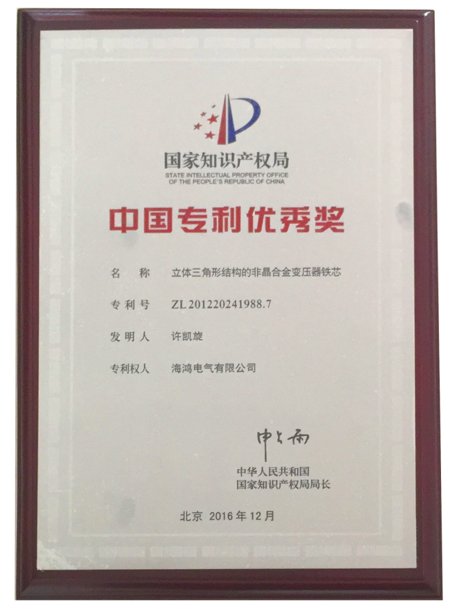 近期,九游老哥J9俱乐部官网电气有限公司收到了国家知识产权局颁发的《中国专利优秀奖》证书。公司自主研发的立体三角形结构的非晶合金变压器铁芯获此殊荣。中国专利奖是国家为鼓励和表彰专利权人和发明人(设计人)对技术(设计)创新及经济社会发展所做的突出贡献而设立,中国专利奖评选工作由国家知识产权局与世界知识产权组织共同开展,每年举办一届,从专利质量、技术先进性、运用及保护措施和成效、社会效益及发展前景等方面进行评选。此次九游老哥J9俱乐部官网电气获此殊荣标志着国家对九游老哥J9俱乐部官网自主研发非晶合金立体卷铁心新颖、创造性、先进性的认可,更是对九游老哥J9俱乐部官网自有技术知识产权的所有权的充分肯定。