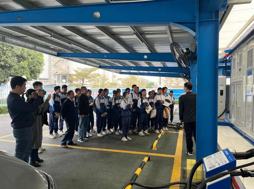 1月9号上午,开平市金山中学八年级拓展班110名学生和12名老师抵达九游老哥J9俱乐部官网电气有限公司科普基地,参观的学生和老师一共分为三批次,依次轮流参观多功能展示厅、智能监控厅、电气事业部车间、132kV项目部车间、以及集成一体式光储充电站、立体集成模块乡村充电示范站。在工作人员的带领下,一群青春洋溢的初中生带着满脸期待,踏入了这个充满现代科技气息的空间,在他们的身旁,是同样满怀热情的老师,他们此行的目的是为了让学生们近距离感受科技的力量,激发他们对科学技术的兴趣和热爱。为了让师生们更好的理解变压器、箱式变电站的工作原理及其重要性,技术讲解员采用生动形象的语言结合实物演示的方式进行讲解。
